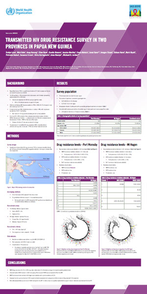 Surveillance of transmitted HIV drug resistance (TDR) in individuals recently infected with HIV was performed following WHO-suggested methods. The prevalence of transmitted HIV drug resistance (TDR) in recently infected antiretroviral drug naïve individuals in PNG has not been fully characterised.